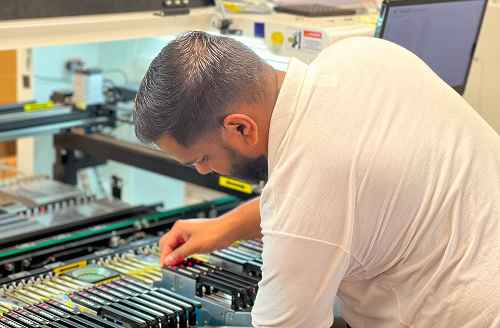 PCB assembly at DSL begins with a bare PCB, sourced from trusted suppliers to ensure authenticity and quality. Electronic components, delivered in reels and trays, are meticulously loaded into our dual in-line Pick and Place machines. The first step in the assembly process involves applying solder paste to the thousands of pads on the bare PCB.